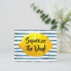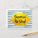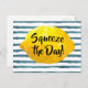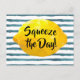 Funny quote postcard featuring a 3D lemon framing the quote "Squeeze the Day" in bold calligraphy script set on a watercolor pattern of blue stripes.