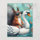 An adorable squirrel rides on a inflatable swan enjoying the nice summer weather