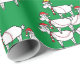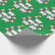 This whimsical holiday gift wrap features hand drawn goats in Santa hats stacked on each other with a gold star on top, on green backround.