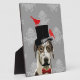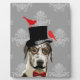 Funny cute steampunk style dog illustration in a top hat and bow tie digital collage on a grey vintage damask background, and red birds. For matching products and more humourous animal characters visit the VINTAGEPRINTSTORE.