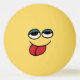 This table tennis ball has a face on it that is sticking out its tounge. It is one of a variety of ping pong balls aquirable from Superkalifragilistic.