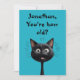 A birthday card with an illustration of a very surprised black cat on a blue background. Fully editable text on the front and back. Create your personal birthday card.