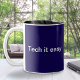 Relax and enjoy your coffee break with this stylish mug. In dark midnight blue, the mug displays the amusing pun 'Tech it easy' in clear white lettering. Personalise the other side with a monogram initial for the finishing touch. In a calming minimalist style, the humourous mug makes an ideal gift for I.T. professionals, computer science students and fellow lovers of technology.