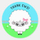 These funny thank you stickers feature an illustration of a cute sheep with a pink bow. The white sheep has sparkly cute eyes with long lashes. The sheep is saying "Thank Ewe!" but you can customise these stickers with your own name or message. The stickers have bright blue and green colours for a green pasture that has a couple of white daisies in the background. The is a brown wooden fence in the background.