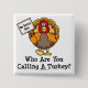 This little turkey doesn't want to be part of your family meal. A cute and funny turkey holding a sign that says No Turkey Here with the words Who Are You Calling a Turkey beneath it. A cute Thanksgiving, hunting or Christmas dinner design on t-shirts, apparel, merchandise and more holiday gifts.
