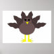 This poster features a funny cartoon of a turkey with big black eyes, a small yellow beak and tail feathers sticking up. The feet are facing in opposite directions making the turkey look clumsy. This amusing design is ideal for Thanksgiving.