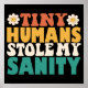 Funny childcare teacher groovy quote design tiny humans stole my sanity. Daycare and child care provider taking care of children and kids as tiny human tamer. Awesome present idea for childcare provider teacher, dad, mum, sister, brother, grandma, grandpa, aunt, uncle, friend, coworker... funny teacher appreciation present idea, who love teaching boys and girls some things. Grab it for birthday, teacher's day, father's day, mother's day...