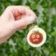 Funny tomato keychain with a cartoon illustration of a weird tomato character with stuck out tongue and a puzzled look in its eyes.