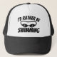 Funny trucker hat for swimmer and swim coach. Black and white sports cap with image of swim goggles and humourous swim quote. Cool headwear for teens and adults. I'd rather be swimming. Birthday or Christmas gift idea for him or her. Also great for water polo players.