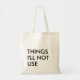 This tote bag is a stylish and functional accessory that combines the best of both worlds: fun and playful typography with a minimalist design that makes it versatile and easy to wear with any outfit and adds a touch of sophistication and elegance to the overall look. The typography design is bold and eye-catching, with a playful quote reading "Things I'll not use".