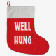 This stocking says it all. It features a red striped background with white trim top and the caption "Well Hung". Hang it well. Hang it with pride.
