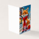 Illustration of a cheerful anthropomorphic fox sitting in the vibrant city street, now transformed for the holiday season. The fox, adorned with a playful red scarf and a tiny Santa hat, beams with joy. The urban background is dusted with soft, white snow, creating a cosy, festive atmosphere. Snowflakes gently fall around the scene, and the trees lining the sidewalk are decorated with twinkling lights and colourful ornaments. The light blue vintage car is now decked with a wreath on the front, enhancing the whimsical charm.