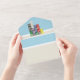 This science-themed all-in-one invitation with removable RSVP card features a background of Bohr model atoms in pale blue on a sky blue base. Layered on top of this pattern are panels of cream with a white line to give the impression of baseboard at the bottom of a wall providing a base for sample text on the interior that can be customised for your event and blank space on the exterior that can be used for addressing the cards to the recipient and the returnable section with the appropriate return address. Finally a chemistry themed set of wooden alphabet blocks featuring the chemical formula for oxytocin, the "cuddle hormone" sits on the flap above the text and on the back when closed. Mixed around the elements of the formula are blocks with tools and structures to showcase some of the variety of concepts and fields associated with chemistry, including test tubes, a flask, molecular structures, and an electron orbital. Be sure to check out the full Future Chemist's Blocks collection for more great gifts and products for a baby shower or the little one in your life.
