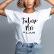 Modern wedding "Future Mrs" custom shirt design for the bride features a modern black and white colour scheme with bold and playful handwritten calligraphy script typography with stylish scroll details. Personalise the casual yet elegant custom text her new / future married last name.
