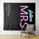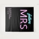 Cool modern "future Mrs" personalised black photo booth tapestry for your bridal shower, with "future" and "MRS" written in teal blue and hot pink scripts with a neon lights effect. You can personalise with your name and shower date. The bottom corner is left blank for an area for your guests to take photos.