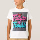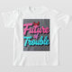 The image features a bold and playful design with the phrase "Future of Trouble" prominently displayed on a grey t-shirt. The text is styled in vibrant colours, with "Future" in pink and "Trouble" in teal, creating a striking contrast against the neutral background. A red devil horn icon adds an edgy, rebellious touch, reinforcing the theme of mischief and confidence.