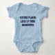 Warn those parent of little girls early that you have a potential player around, with this fun baby boy's one piece crawler suit. Blue block text reads, Future Player Lock Up Your Daughters. Chose size and colour you like best.