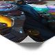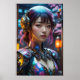 A futuristic, anime-style character with vibrant colours is depicted wearing advanced technology gear and headphones. The background features cherry blossom trees and gently glowing lanterns.