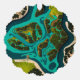 A vibrant aerial illustration of lush green islands and winding waterways, blending teal and emerald tones in a bold, futuristic style. This top-down view captures the intricate network of land and water, showcasing the unique beauty and architecture of floating landscapes.