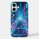futuristic neon cityscape, streets illuminated with bright blue and purple lights in cyberpunk style, holographic signs, minimalist and stylish design, vertical format