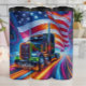 This vibrant and futuristic illustration features a black semi-truck with glowing, multicolored neon lights. The truck is driving down a road of streaking light trails, set against a large American flag. The dynamic and energetic design captures a modern, high-tech, and patriotic theme.