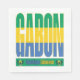 The national flag of Gabon is infused into the name of the country. Underneath that image is the country name as it is known nationally, and at either side of the name are two national coat of arms.