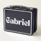 The contemporary font used for Gabriel's name adds a modern and timeless touch to this lunchbox, ensuring it remains stylish and relevant. Its multipurpose design allows it to transition seamlessly between roles, whether as a lunch pail, an organiser for school supplies, or a personal storage container. With its bold design and sturdy construction, it’s built to last and keep up with Gabriel’s active lifestyle.