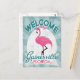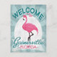 Gainesville Florida pink flamingo. In vintage travel posters style, it says "Welcome To Gainesville, Florida" in pink, white and mint green turquoise.