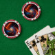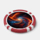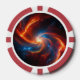 A spiral galaxy with major arms in hues of red and yellow like they are glowing with fire. Lesser arms of bright blue-white star clusters intertwined.
