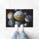Beautifully designed fractal planets surrounded by stars suspended into space, in main colours of gold and blue.