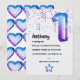 Trendy blue and purple galaxy faux foil number balloon first birthday party invitation with a masculine flair.