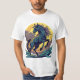 This galloping horse T-shirt design captures the essence of speed and freedom with a stunning portrayal of a horse in full stride. The horse is depicted with dynamic lines and intricate shading, emphasizing its powerful muscles and flowing mane that trails behind in the wind. The design features a blend of earthy and metallic colours, giving the horse a lifelike appearance while adding an artistic, almost mythical aura. Dust clouds at the hooves and a faint horizon line suggest movement across open landscapes, symbolising unbridled spirit. Perfect for horse lovers, this T-shirt design celebrates nature’s raw beauty and untamed energy.