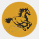 A fantastic illustration of a galloping horse. This horse is a golden chestnut brown colour with a black mane and tail. He can be seen galloping fast with clouds of dust being kicked up by his heels. His mane and tail flying in the breeze. Great for horse lovers.