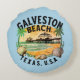 Decorative round pillow featuring a retro style vignette of the Galveston Beach, TX waterfront.