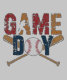 A bold and minimalistic "Game Day" graphic featuring a distressed design. The letter "O" is replaced by a detailed baseball, while crossed bats below the word "Game" emphasize the sporting theme. A silhouette of a batter in action enhances the dynamic appeal, making this design perfect for game day apparel and accessories.