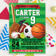 Featuring, baseball, soccer, football, tennis, basket ball and a referee's whistle this invitation can be used for any age.