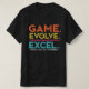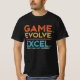 This t-shirt features the motivational phrase Game, Evolve, Excel in a bold, multicolor design. Each word is a different vibrant hue, creating a dynamic and eye-catching look. The overall style is clean and uncluttered, letting the multicolored text take centre stage.