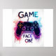 Game Face On! Controller Art- A black gaming controller with glowing neon pink and blue accents is depicted against a white background. The controller is positioned in the centre of the image, with the words "GAME" and "FACE ON!" written in a bold, black, brushstroke font above and below it. The background features abstract watercolor-like splashes of pink, blue, and red, creating a powerful and energetic atmosphere.