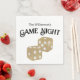 These custom party napkins feature a Game Night theme. An image of playing dice are printed in the centre in a gold glitter design. The phrase "Game Night" is printed above the dice with a sample family name. You can personalise the napkins to include your own custom name or text.