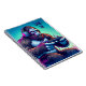 Funny notebook with an ai illustration of a psychedelic bigfoot playing video games with headphones on. Purple and blue hues and text that say game on but can be personalised.