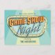 Game Show Night Invitation Postcard featuring a typographic sign of "Game Show Night''. This designs include elements of of blue, yellow, red and orange, a game show podium, light up sign, and elements inspired by retro game shows. Products include a template for personal customisation.