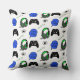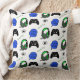 Gaming themed pillow with lime green and black graphics such as headphones, controllers and text level up.