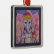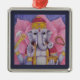 An ornament with my 18" square watercolor pencil painting of Ganesh. Ganesh is a Hindu god. He is the remover of obstacles, patron of arts and sciences, the lord of intellect and wisdom, the god of beginnings, and patron of letters and learning. He holds his own broken tusk in his lower-right hand and holds a delicacy, in his lower-left hand. In one upper arm, he holds an axe, and in the other upper arm, a noose. I have placed him seated in front of a pink lotus flower, as part of a symbol of new beginnings unfolding.