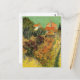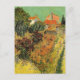 Garden Behind a House by Vincent van Gogh is a vintage fine art post impressionism landscape nature painting. A field of beautiful flowers growing in rows in a garden behind a farmhouse on a sunny summer day.