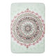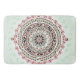 An abstract design of concentric rings in leaf, vine, and nature motifs. Stylised in pale turquoise and varying hues of reds, pinks and red-browns on a pale blue green background. Matching shower curtain available!