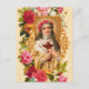 Saint Rose of Lima is surrounded by an arrangement of beautiful, colourful flowers and ornate scroll work. A background of yellow brocade compliments the elaborate illustration collage.
