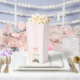 Shower for a baby girl featuring blooming garden roses in shades of blush pink and lilac. Trendy cream archway and pink bow against a pastel striped background. Some design element(s) licensed under CC0