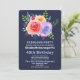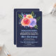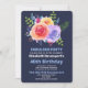 Birthday party invitation with a pretty bouquet of watercolor roses and other colourful sprigs, leaves and branches. Set on a midnight blue background.