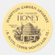 Personalise with your business name, address, and honey weight. Central illustration of a vintage skep hive in a garden surrounded by bees. Ideal for beekeepers and honey sellers. Common honey net weight conversions: 8oz (227g), 12oz (340g), 16oz (454g), 32oz (907g), 5lb (2.27kg).