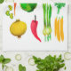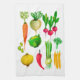 A cheerful watercolor art themed kitchen towel featuring a vibrant selection of hand painted garden vegetables on a